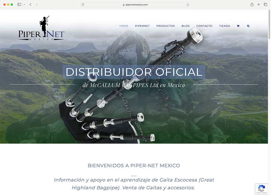 Diseño y desarrollo de sitio web realizado para Pipernet México, empresa dedicada a la comercialización de Gaitas.